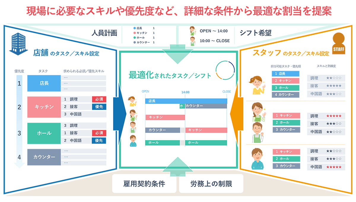 - スタッフのスキルや優先順位を考慮した適切な人員配置を実現