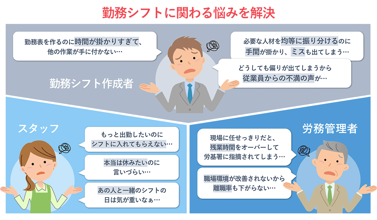 - 公平均一なシフト作成により、スタッフの不平不満解消