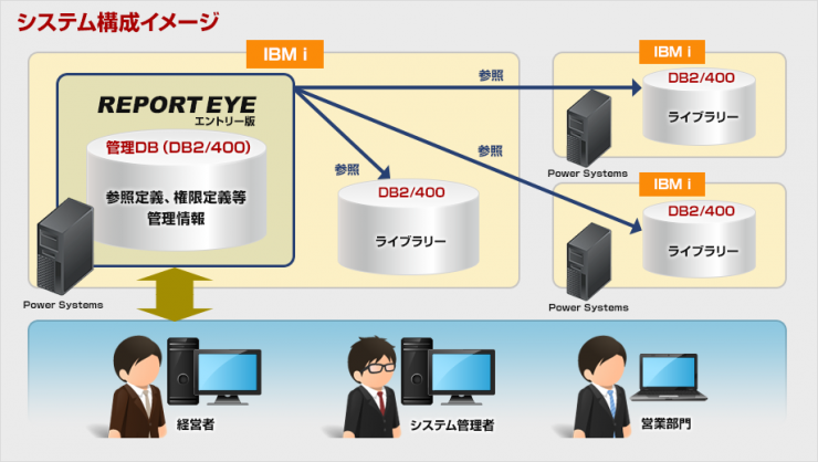 REPORT EYEは、IBM i 上で動作し、リアルタイムにデータの照会・更新・分析が可能な誰でも簡単に使いこなせるレポーティングツールです。