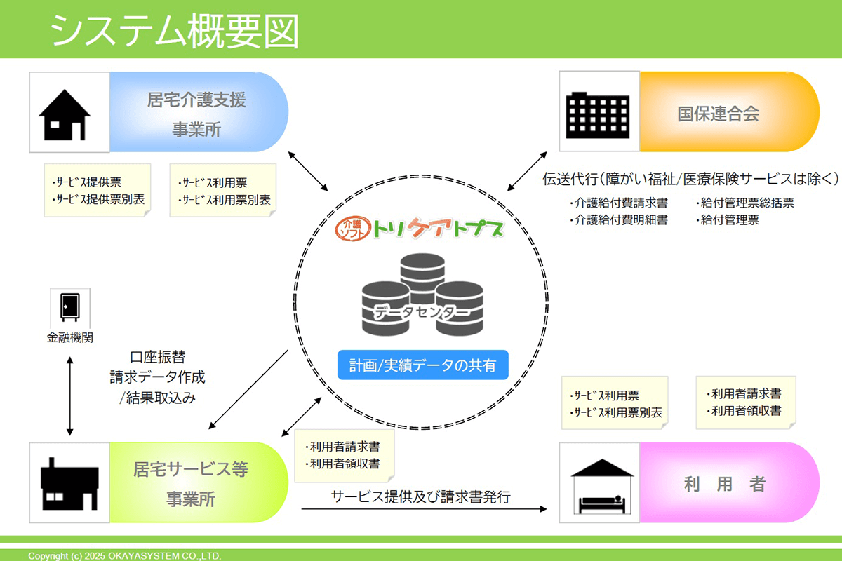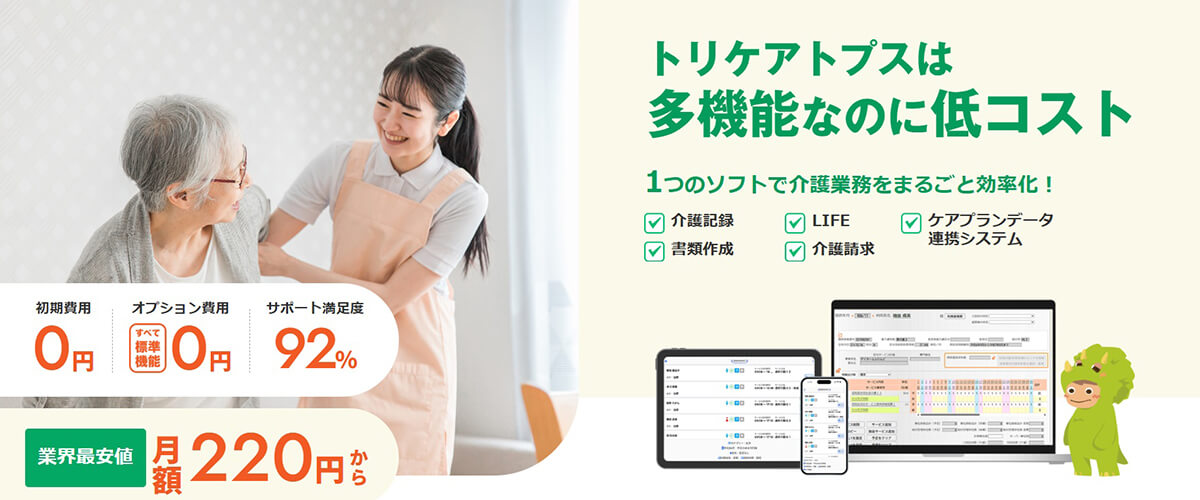 トリケアトプスは、介護・医療・障がいサービスに対応したクラウド型ソフトです。介護記録を入力すると請求へ連動し、自動で書類を作成します。料金体系は、業界最安値の従量課金制で、上限金額もあるので、安心してご利用いただけます。計画書類作成や国保連・利用者請求はもちろん、シフト作成やアプリ連携、LIFEやケアプランデータ連携対応など、低価格帯の介護ソフトながら、多くの機能が付いたコスパの良いソフトです。
